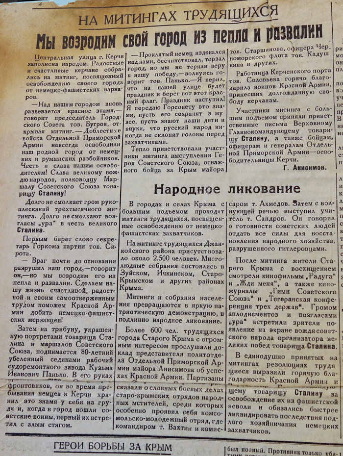 Освобожденные Керчь и Джанкой возвращаются к мирной жизни. Газета "Красный Крым", 23 апреля 1944 года