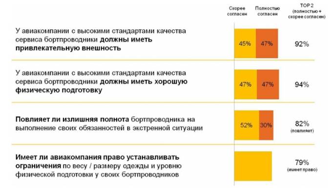Как выяснилось, большинство пассажиров считают, что у авиакомпании с высокими стандартами качества сервиса бортпроводники должны иметь привлекательную внешность — так ответили 92% участников опроса (в том числе 47% полностью согласны). Не согласны с этим утверждением только 7% участников опроса. «Сверхнормативный» вес бортпроводников создает неудобства для пассажиров, а в экстренной ситуации может оказаться угрозой. Бортпроводник любого пола должен иметь возможность двигаться в проходе между креслами, не задевая сидящих пассажиров, и разминуться с пассажиром в проходе даже в случае отсутствия рядом свободных мест», – говорится в результатах опроса.