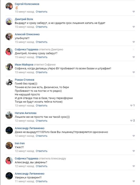 Мнения участников группы разделились. Кто-то к проблеме Софачки подошел серьезно и напомнил, что новые права вряд ли выдадут, так как сам факт утери водительского удостоверения пробивают по базам. Пользователь Роман посоветовал ездить вообще без прав и познать искусство маскировки: «Гоняй без прав. Точнее, если они есть физически, то бери. Пробивают-то на постах и то редко. Не нарушай просто. И для отвода глаз в базе тачку переоформи. Тогда не будут искать тебя в потоке».