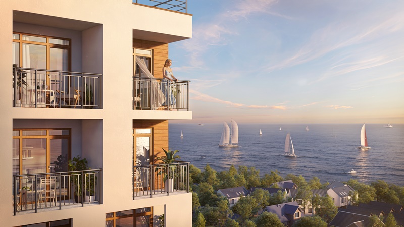 Апарт-комплекс разместится на территории площадью 17 гектаров. Первая очередь проекта включает три корпуса переменной этажности – от 5 до 9 этажей. Архитектурная концепция комплекса вдохновлена морским пейзажем: светлые фасады и панорамное остекление наполняют пространства естественным светом и открывают виды на морской горизонт.