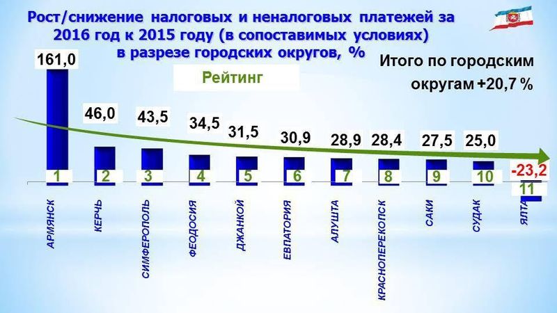 Всего, по данным министерства финансов Республики Крым, в бюджеты городских округов за 2016 год зачислено 5,8 млрд рублей, что на 991,8 млн рублей (20,7%) больше, чем за 2015 год.