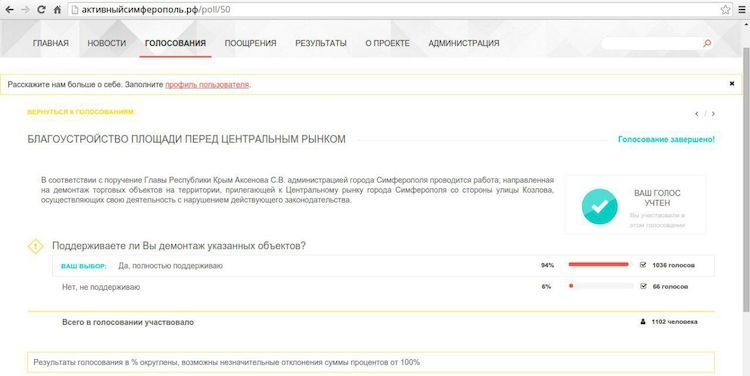 «В соответствии с поручением главы Крыма Сергея Аксёнова администрацией Симферополя проводится работа, направленная на демонтаж торговых объектов на территории, прилегающей к Центральному рынку города со стороны улицы Козлова, осуществляющих свою деятельность с нарушением действующего законодательства. Поддерживаете ли Вы демонтаж указанных объектов?» – спрашивали власти горожан.
