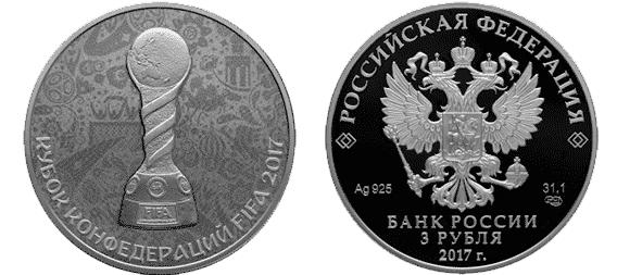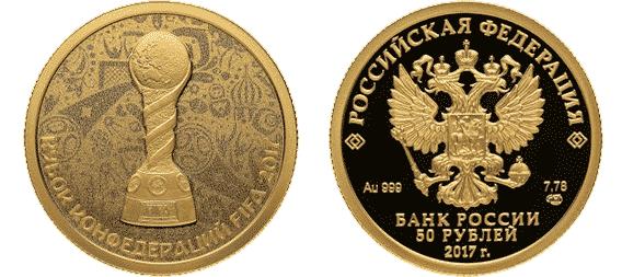 На реверсе монет «Кубок конфедераций FIFA-2017» расположено рельефное изображение Кубка конфедераций FIFA на фоне орнамента, состоящего из элементов, отображающих российскую культуру и фольклорное наследие, а также футбольный мир, внизу по окружности имеется надпись – «КУБОК КОНФЕДЕРАЦИЙ FIFA 2017». Номиналы монет – 3 рубля и 50 рублей, вес – 31,10 гр и 7,78 гр, диаметр 39 и 22,6 мм, тираж 10 000 шт. (серебряная) и 5 000 шт. (золотая). Цена продажи серебряной монеты – 3 500 рублей. Цена продажи золотой монеты – 29 500 рублей.