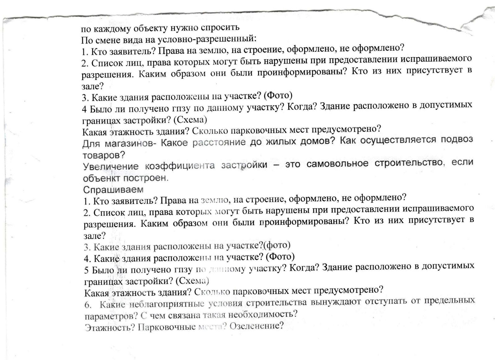 В распоряжении Крыминформа оказалась инструкция, которую, по всей видимости, перед началом слушаний раздавали своим сторонникам протестующие активисты. В задачи граждан входили обязанности задавать выступающим как можно больше вопросов по каждому без исключения представленному проекту. «По каждому объекту нужно спросить», – такими словами начинается листовка. Дальше перечисляются вопросы, которые должны были звучать из зала.