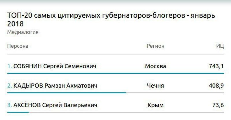 Индекс цитируемости Аксёнова составил 73,6. На первой позиции рейтинга оказался мэр Москвы Сергей Собянин с индексом цитируемости более 743. Второе место занял традиционно популярный губернатор-блогер Рамзан Кадыров с индексом почти 409.
