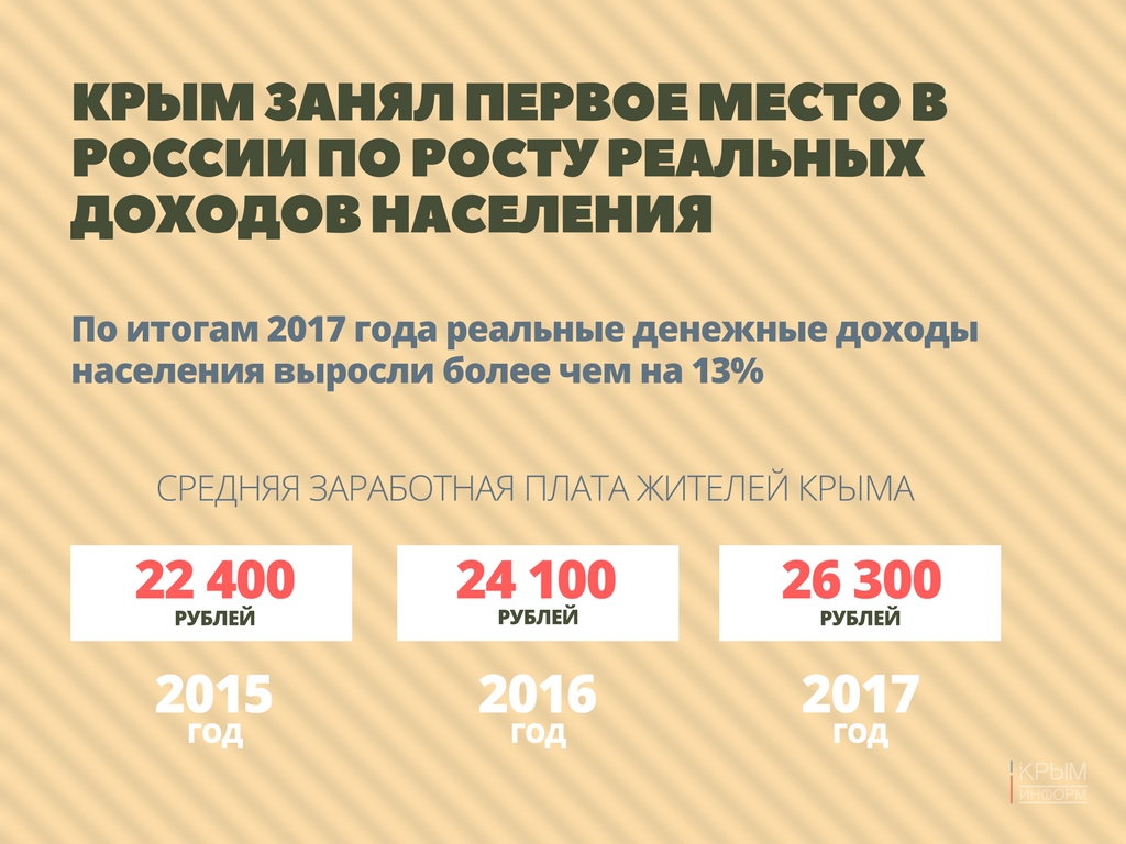 По информации главы Крыма, средняя зарплата в 2017 году на территории полуострова выросла по сравнению с 2016 годом на 6% и составила 26,3 тысячи рублей. «В то же время Крым занимает шестое место среди восьми субъектов Южного федерального округа по размеру среднемесячной зарплаты. По данному показателю мы опережаем только Адыгею и Калмыкию», – отметил он.