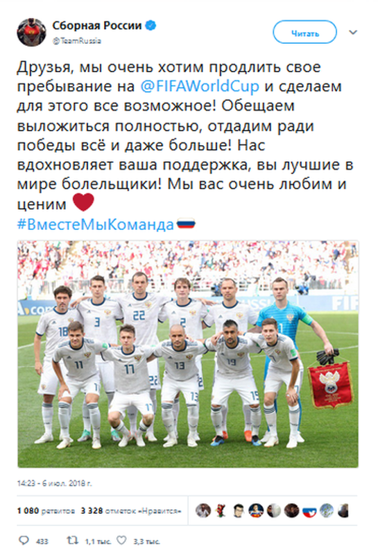 «Друзья, мы очень хотим продлить свое пребывание на чемпионате мира ФИФА и сделаем для этого всё возможное! Обещаем выложиться полностью, отдадим ради победы всё и даже больше! Нас вдохновляет ваша поддержка, вы лучшие в мире болельщики! Мы вас очень любим и ценим. Вместе мы – команда», – написали игроки российской сборной.