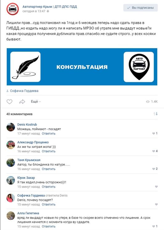 Мнения участников группы разделились. Кто-то к проблеме Софачки подошел серьезно и напомнил, что новые права вряд ли выдадут, так как сам факт утери водительского удостоверения пробивают по базам. Пользователь Роман посоветовал ездить вообще без прав и познать искусство маскировки: «Гоняй без прав. Точнее, если они есть физически, то бери. Пробивают-то на постах и то редко. Не нарушай просто. И для отвода глаз в базе тачку переоформи. Тогда не будут искать тебя в потоке».