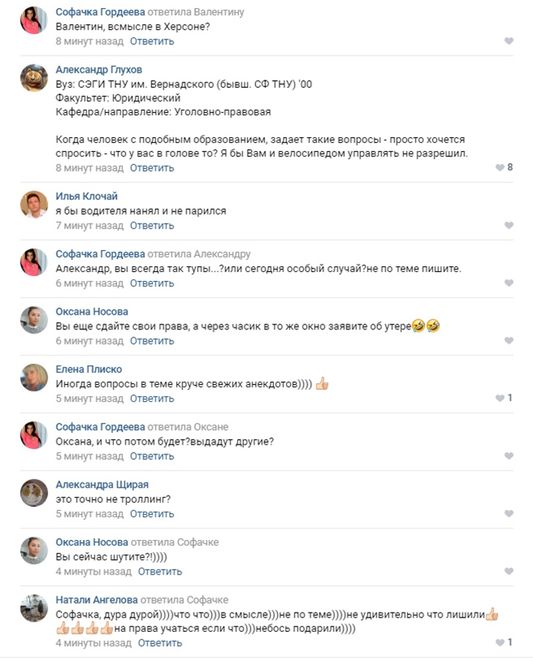 Наиболее популярными комментариями стали короткий «Ах же ты хитрая жопа! )))» и цитата с личной страницы автора, которая приняла активное участие в обсуждении проблемы: «Вуз: СЭГИ ТНУ им. Вернадского (бывш. СФ ТНУ) '00 . Факультет: юридический. Кафедра/направление: уголовно-правовая. Когда человек с подобным образованием задает такие вопросы – просто хочется спросить – что у вас в голове то? Я бы Вам и велосипедом управлять не разрешил».