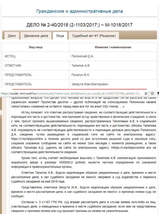 В комментарии Крыминформу Жан Запрута подтвердил, что не представлял интересы Талипова на процессе по иску Полонского. Однако информация на сайте суда говорит об обратном.
