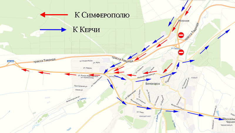 «Для движения в сторону Симферополя жители села Яблочное должны будут пересечь трассу «Таврида» через тоннельный путепровод и выехать к Белогорской развязке через перекресток автодороги Симферополь – Феодосия с ул. Нижегорской. Жители Белогорска, живущие вблизи Яблочной развязки, также будут двигаться этим путем», – говорится в сообщении.